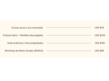 Este sería el valor total de cada elemento si se vendiera por separado, y fácilmente podría costar mucho más, ya que es un programa de desarrollo profesional, acompañamiento y crecimiento real para nuevos líderes.